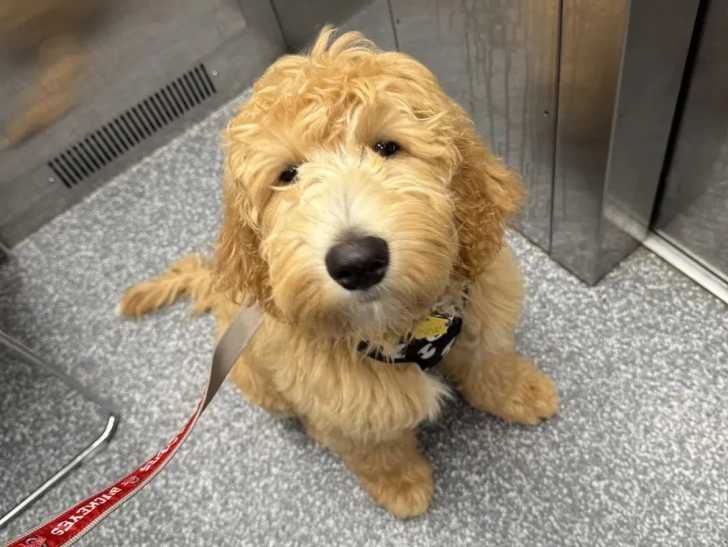 Un Goldendoodle assis dans un ascenseur et qui est tenu en laisse