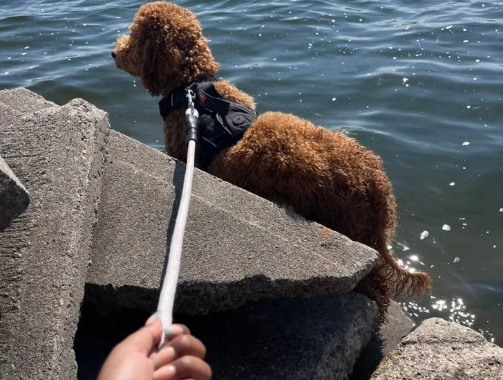 Un Goldendoodle dans l'eau et qui est tenu en laisse