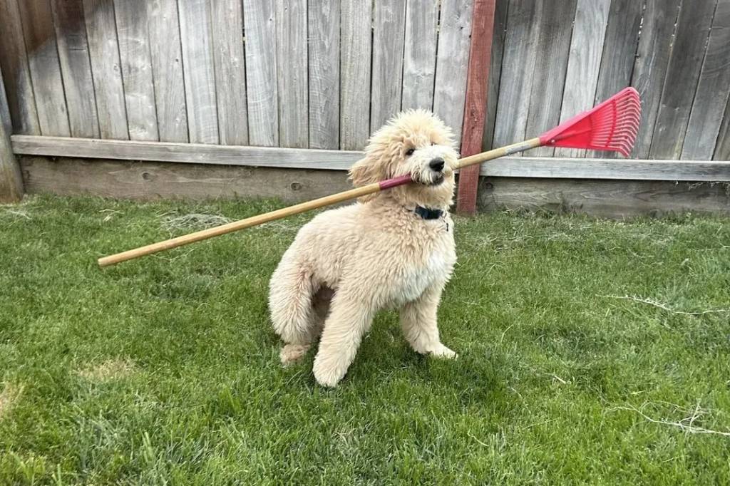 Un Goldendoodle assis sur une surface gazonnée et ayant un râteau dans sa gueule