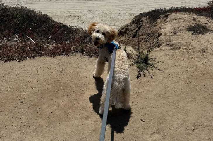 Un Goldendoodle sur une surface sableuse et qui est tenu en laisse