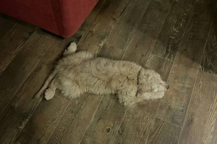 Un Goldendoodle allongé sur un plancher et portant un collier autour du cou