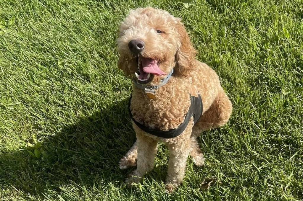Un Goldendoodle sur un terrain herbeux et portant un harnais