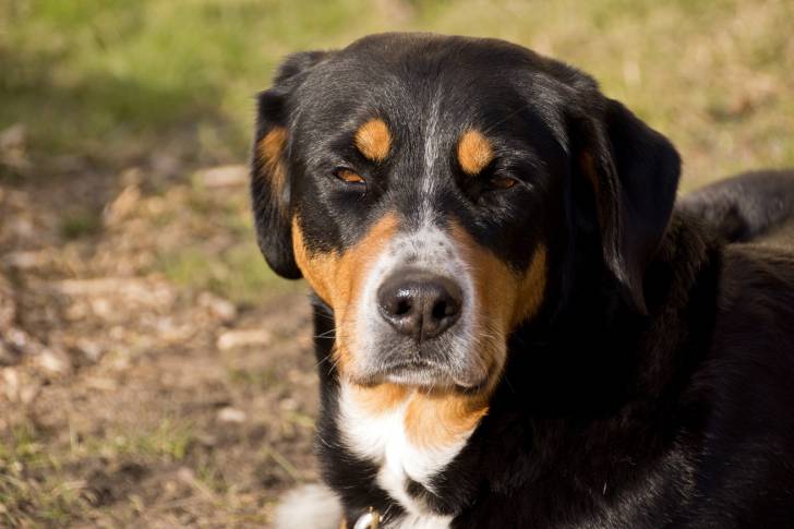 Des chiots Grands Bouviers Suisses en train de têter leur mère et jouer au dehors