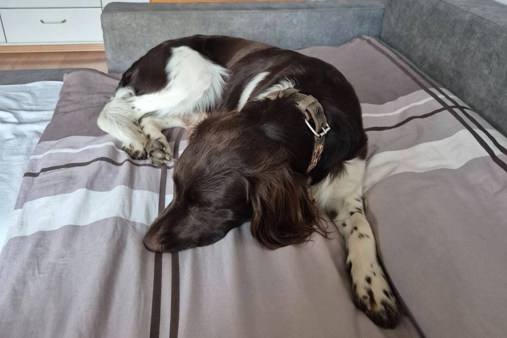 Un Grand Épagneul de Münster allongé sur un canapé et portant un collier autour du cou