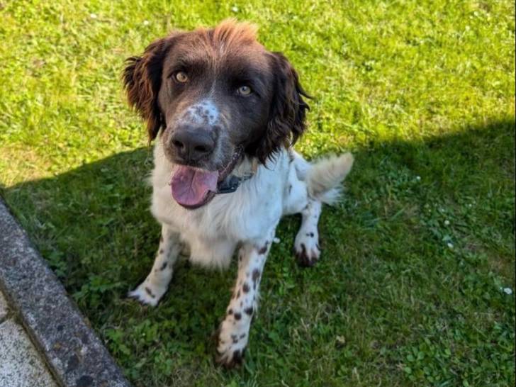 Un Grand Épagneul de Münster assis sur un terrain herbeux et portant un collier autour du cou