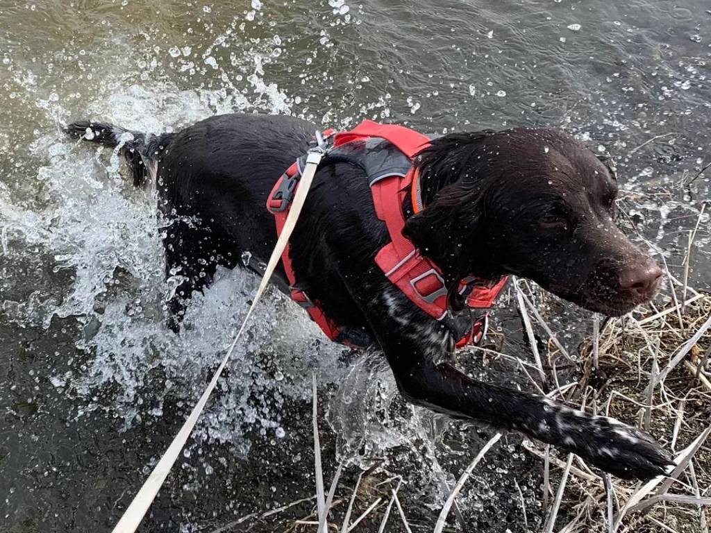 Un Grand Épagneul de Münster dans l'eau et qui est tenu en laisse