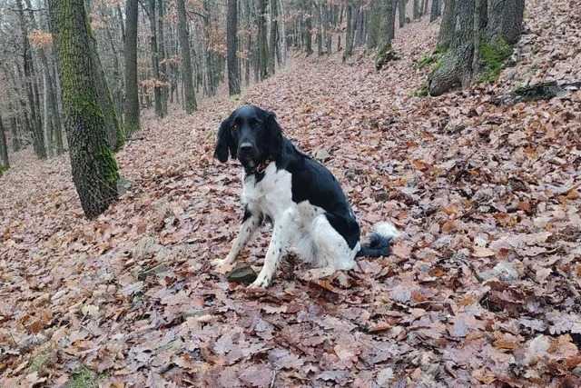 Un Grand Épagneul de Münster assis sur un sol jonché de feuilles mortes et portant un collier autour du cou