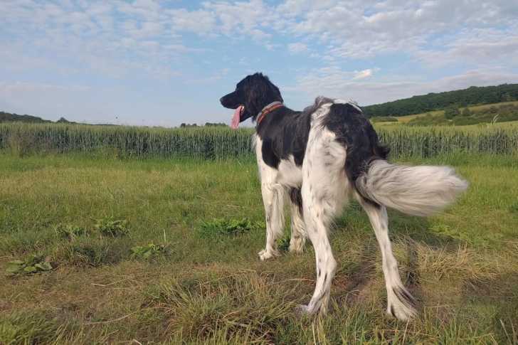 Un Grand Épagneul de Münster sur un terrain herbeux et portant un collier autour du cou