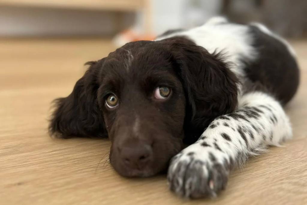 Un Grand Épagneul de Münster allongé sur un plancher
