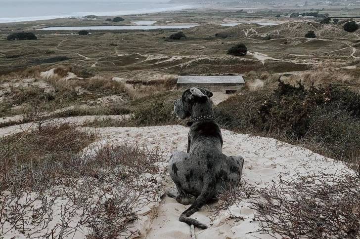 Un Great Danoodle allongé sur une montagne et regardant le paysage.