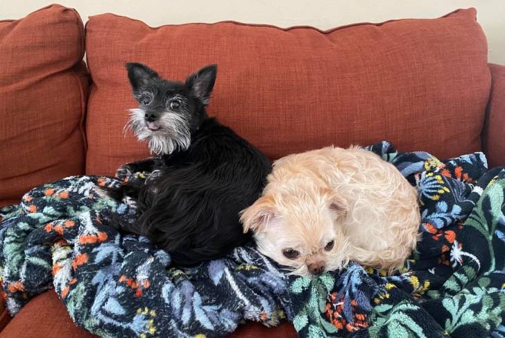 Deux Griffon Bruxellois allongés sur un canapé.