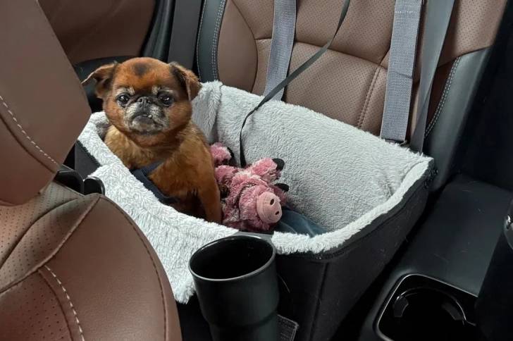 Un Griffon Bruxellois dans un panier et portant un harnais