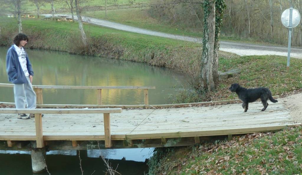Beuh; j'aime l'eau mais pas les ponts... Heureusemement que le frere de ma maîtresse et elle m'encouragent!!!