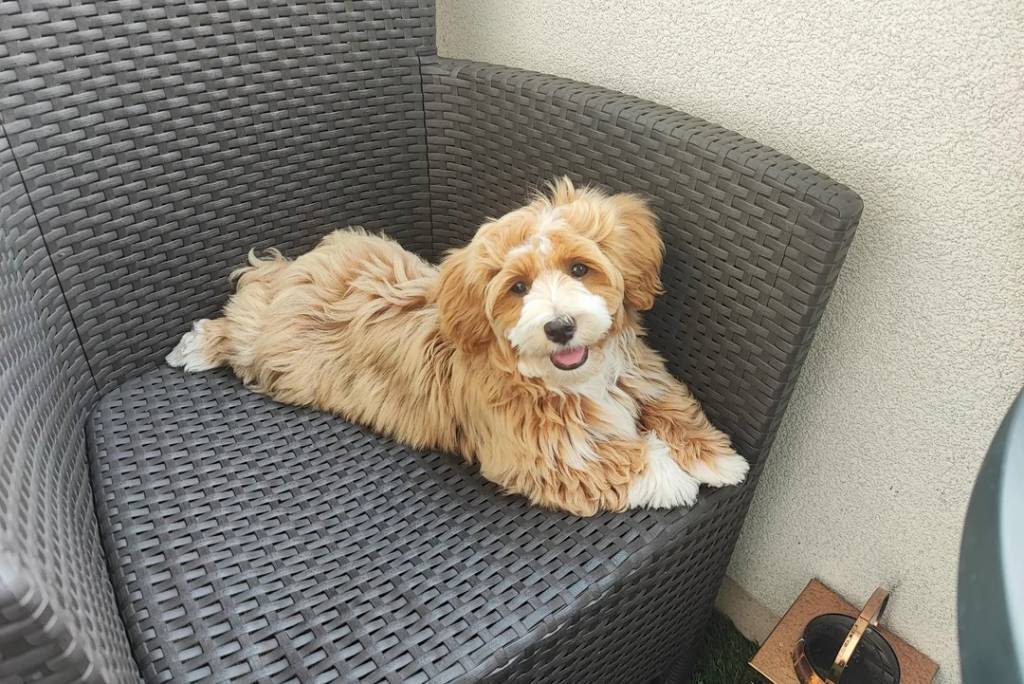 Un Havashire allongé sur une chaise et ayant la gueule légèrement ouverte