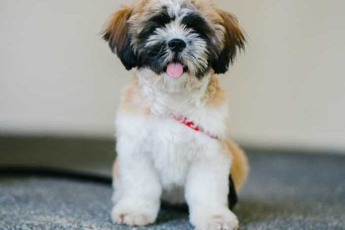 Un Havashu portant une laisse rouge et assis sur un tapis