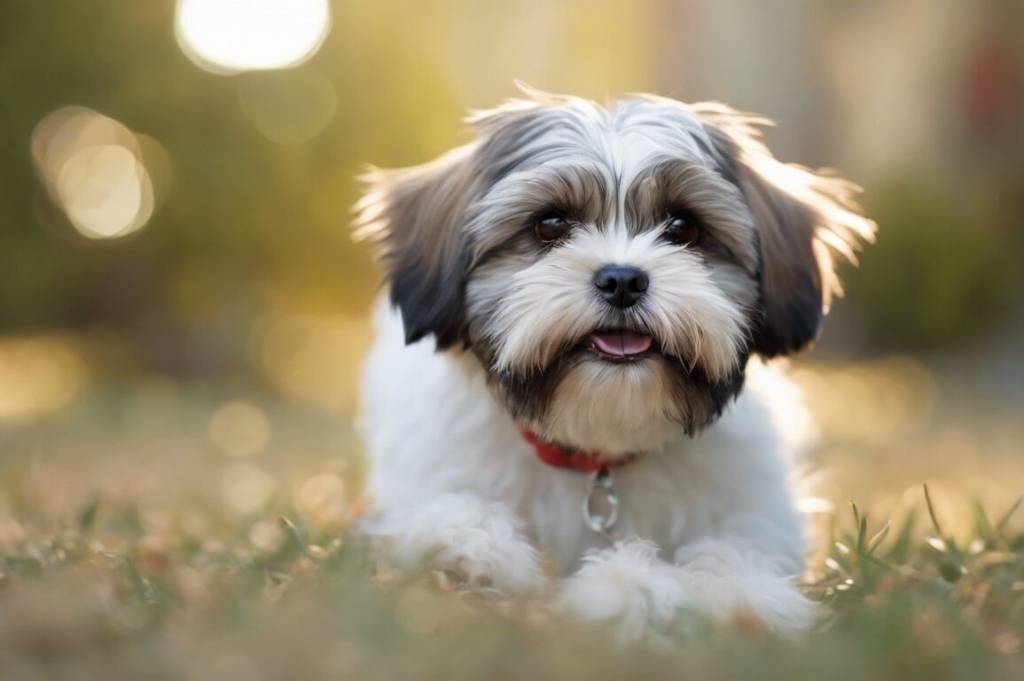 Un Havashu portant un collier et allongé dans un parc