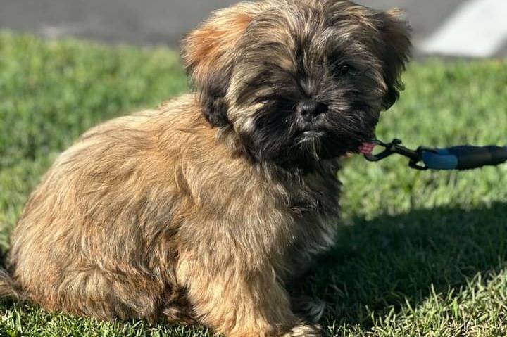 Un Havashu assis sur l’herbe verte avec une laisse attachée à son collier