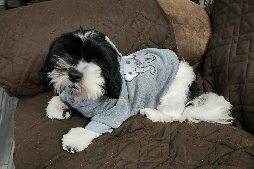 Un Havashu portant un t-shirt gris et allongé sur un canapé
