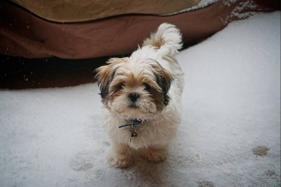 Un Havashu portant un collier et debout à quatre pattes sur une surface enneigée