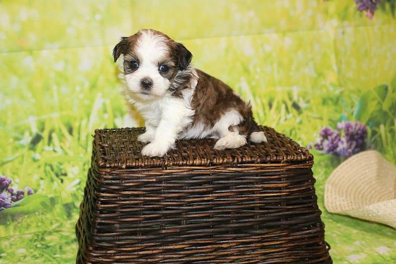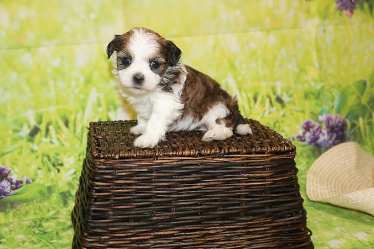 Un Havashu posé sur un panier en osier avec un fond représentant un champ verdoyant avec des fleurs