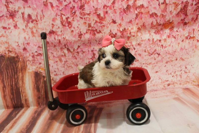 Un Havashu avec un nœud rose sur la tête et assis dans un wagonnet rouge