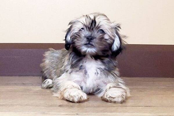 Un Havashu faisant face à la caméra et couché sur un plancher en bois clair