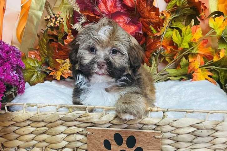 Un Havashu assis dans un panier entouré de feuilles d’automne colorées et de fleurs