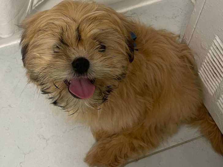 Un Havashu assis sur un sol carrelé blanc à côté d’une plinthe blanche