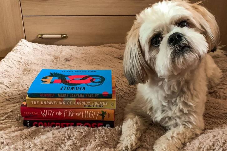 Un Havashu assis à côté d’une pile de livres sur un lit ou une couverture