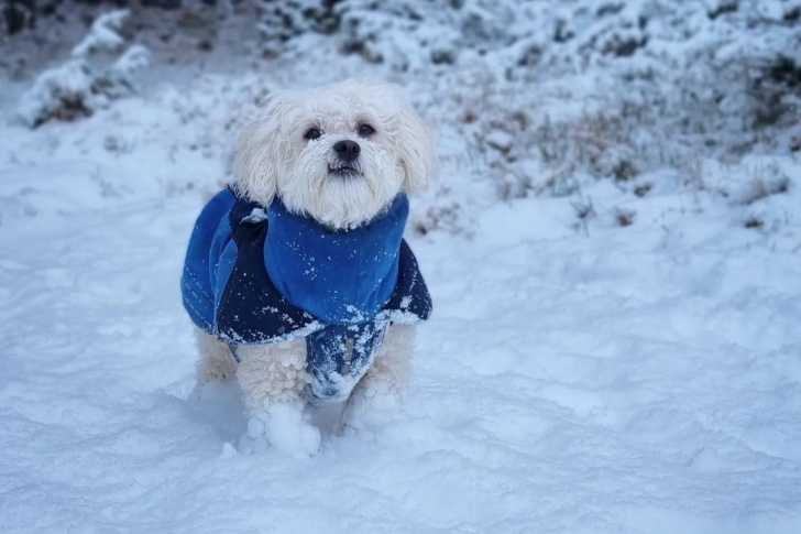 Un Havashu portant un manteau bleu en marchant dans la neige avec une forêt en arrière-plan