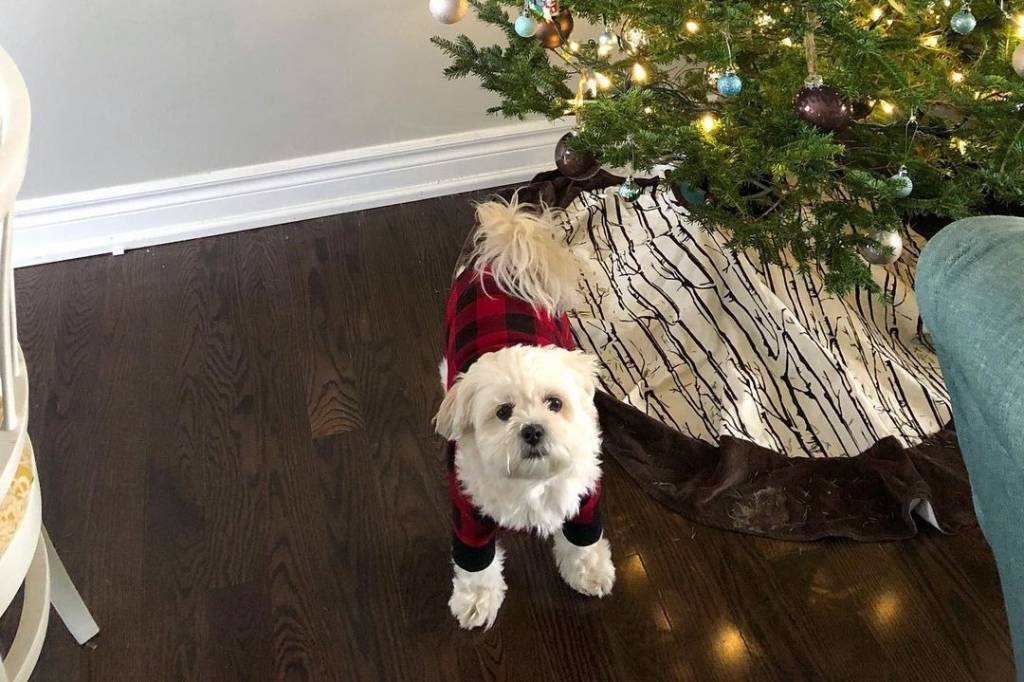 Un Havashu vêtu d’un pull et debout à quatre pattes sur un plancher à côté d’un arbre de Noël
