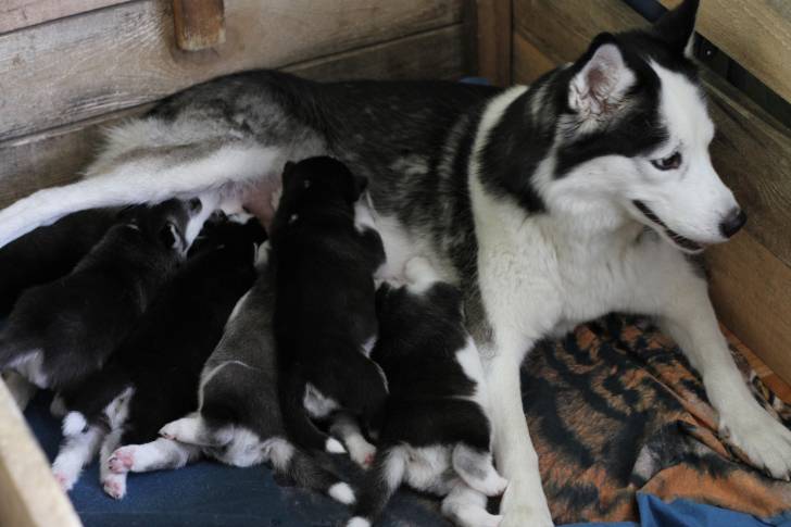 Mise bas d'une chienne Husky donnant naissance à 7 chiots