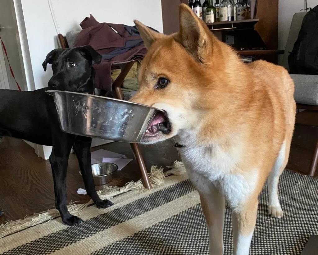 Un Husky Sibérien tenant une gamelle dans sa gueule
