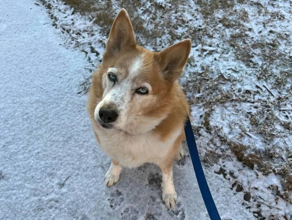 Un Husky Sibérien assis sur une surface et tenu en laisse