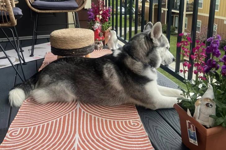 Un Husky Sibérien allongé sur un tapis et admirant le paysage