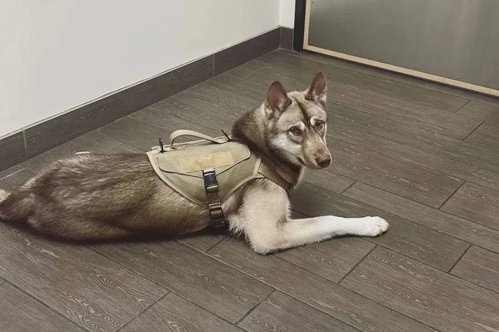 Un Husky Sibérien allongé sur un parquet et portant un harnais