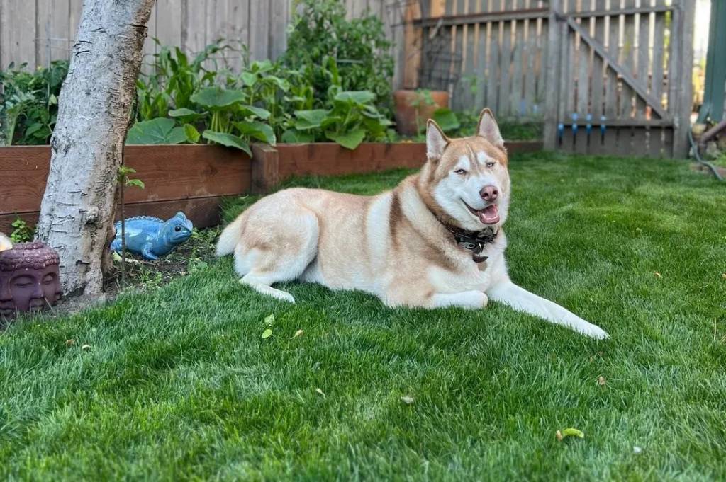 Un Husky Sibérien allongé sur un terrain herbeux et portant un collier autour du cou