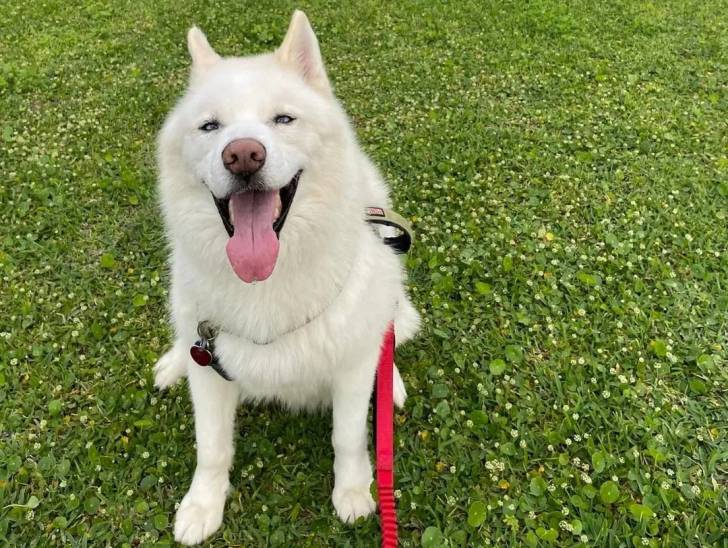 Un Husky Sibérien assis sur un terrain herbeux et tirant la langue