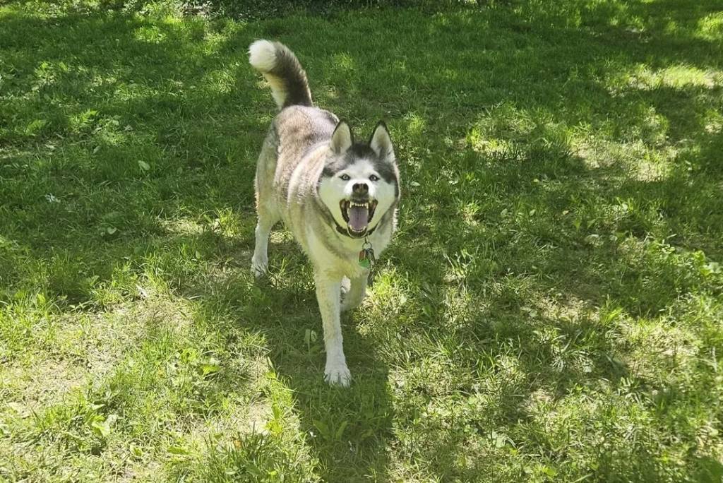 Un Husky Sibérien marchant sur un terrain herbeux et ayant la gueule ouverte