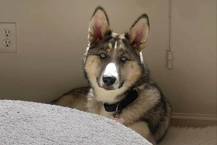 Un Husky Sibérien allongé et portant un collier autour du cou