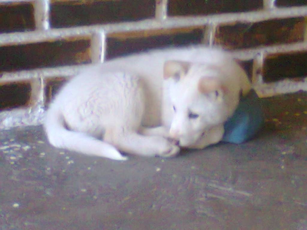 Un petit Husky Sibérien lorgne la gamelle de son père