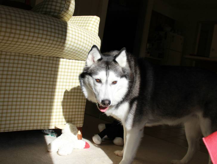 Trois Husky Sibérien et un Maine Coon font la sieste