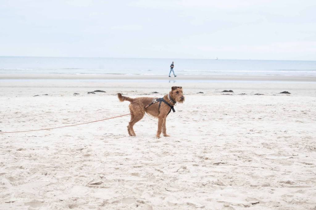 Un Irish Terrier sur une surface sableuse et qui est tenu en laisse