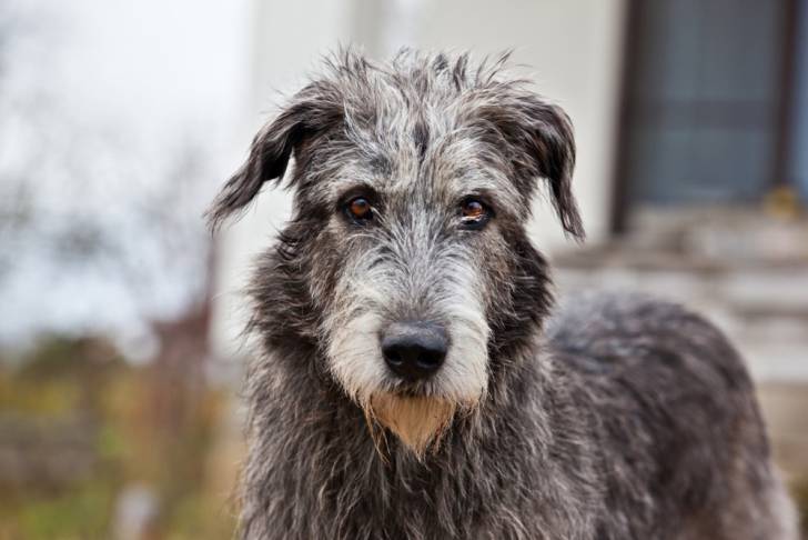 Vue proche d'un Lévrier Irlandais gris dans un jardin