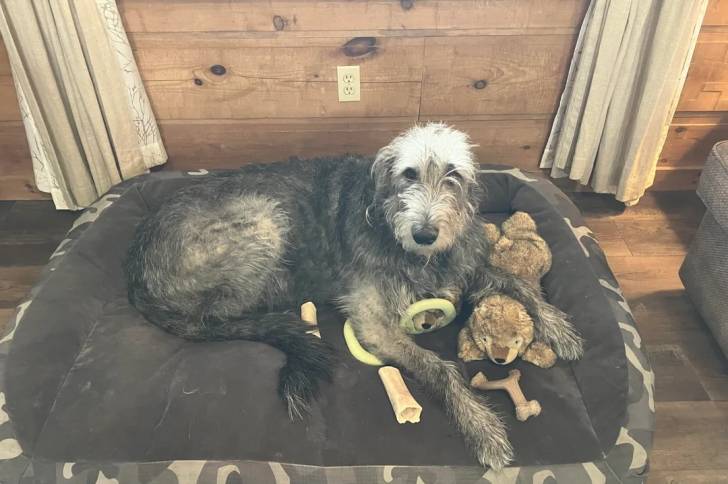 Un Irish Wolfhound allongé dans un panier et regardant vers la caméra