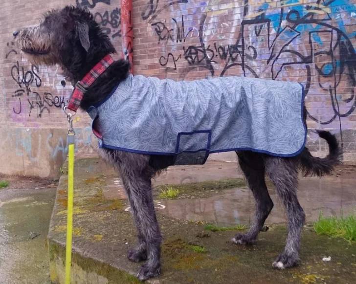 Un Irish Wolfhound sur une surface bétonnée et qui est tenu en laisse