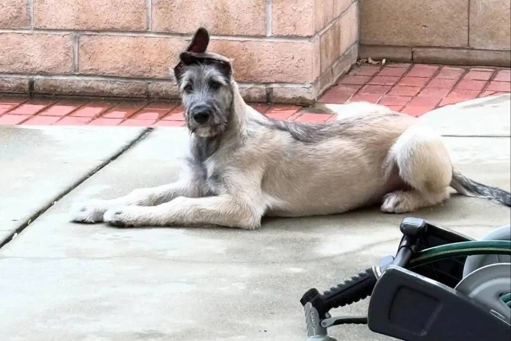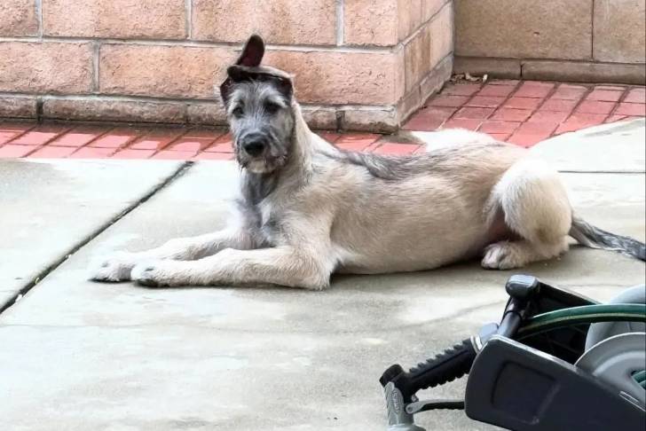 Un Irish Wolfhound allongé sur une surface bétonnée