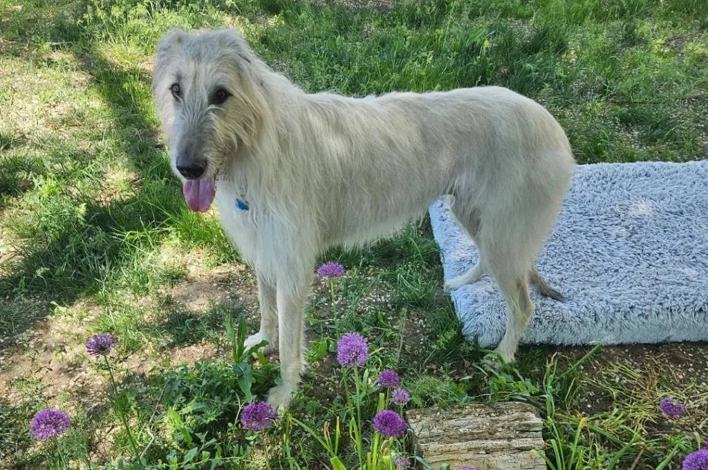 Un Irish Wolfhound sur un terrain herbeux et ayant la langue pendante