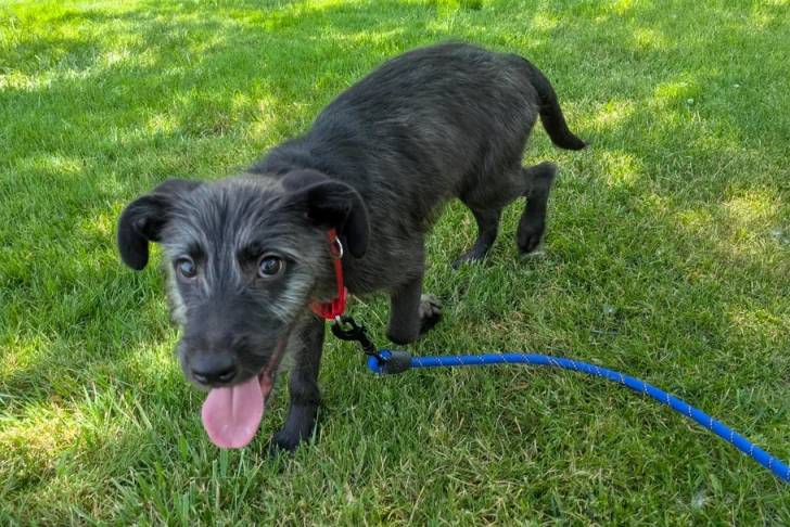 Un Irish Wolfhound marchant sur une surface gazonée et tenu en laisse