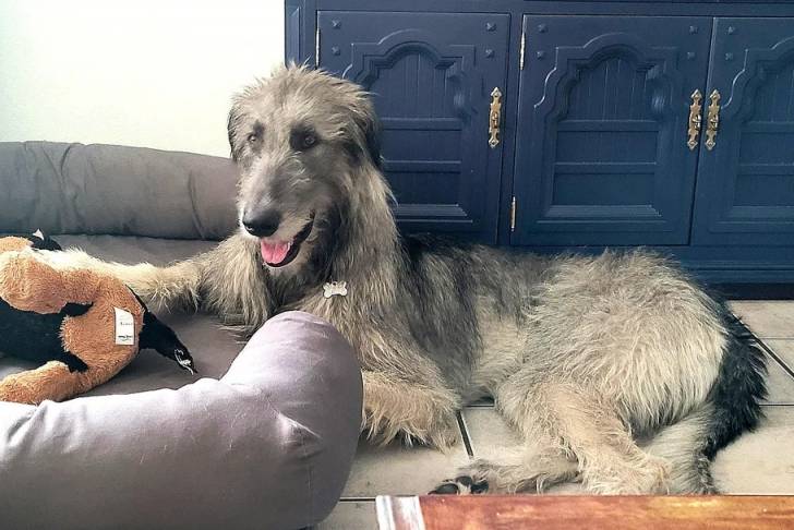 Un Irish Wolfhound allongé dans un appartement et portant un collier autour du cou